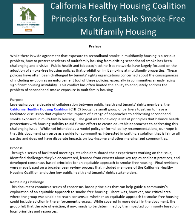 While there is wide agreement that exposure to secondhand smoke in multifamily housing is a serious problem, how to protect residents of multifamily housing from drifting secondhand smoke has been challenging and divisive. Leveraging over a decade of collaboration between public health and tenants’ rights members, CHHC brought a small group of partners together to have a facilitated discussion that explored the impacts of a range of approaches to addressing secondhand smoke exposure in multi-family housing. The result was a set of consensus-based Principles for Equitable Smoke-Free Multifamily Housing that attempts to balance health protections with housing stability to aid future efforts to create equitable approaches to addressing this challenging issue.